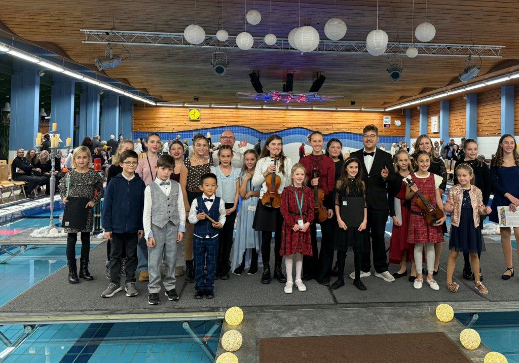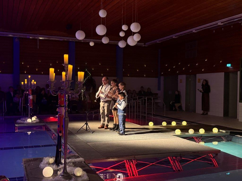 Die Schwimmhalle selbst verwandelte sich erneut in einen stimmungsvoll beleuchteten Konzertsaal. Organisator und Initiator Manfred Schmid hatte auch in diesem Jahr mit viel Herz und Einsatz ein umfangreiches Programm zusammengestellt. Durch den Abend führte Vanessa Schmid. Sie stellte zu Beginn jedes Auftritts die beteiligten Kinder mit kleinen persönlichen Details vor, sodass die jungen Musikerinnen und Musiker im Mittelpunkt standen. Eröffnet wurde das Konzert von Daniel Zhang mit Mozarts „Eine kleine Nachtmusik“, bevor ein breites musikalisches Spektrum die Bühne füllte.